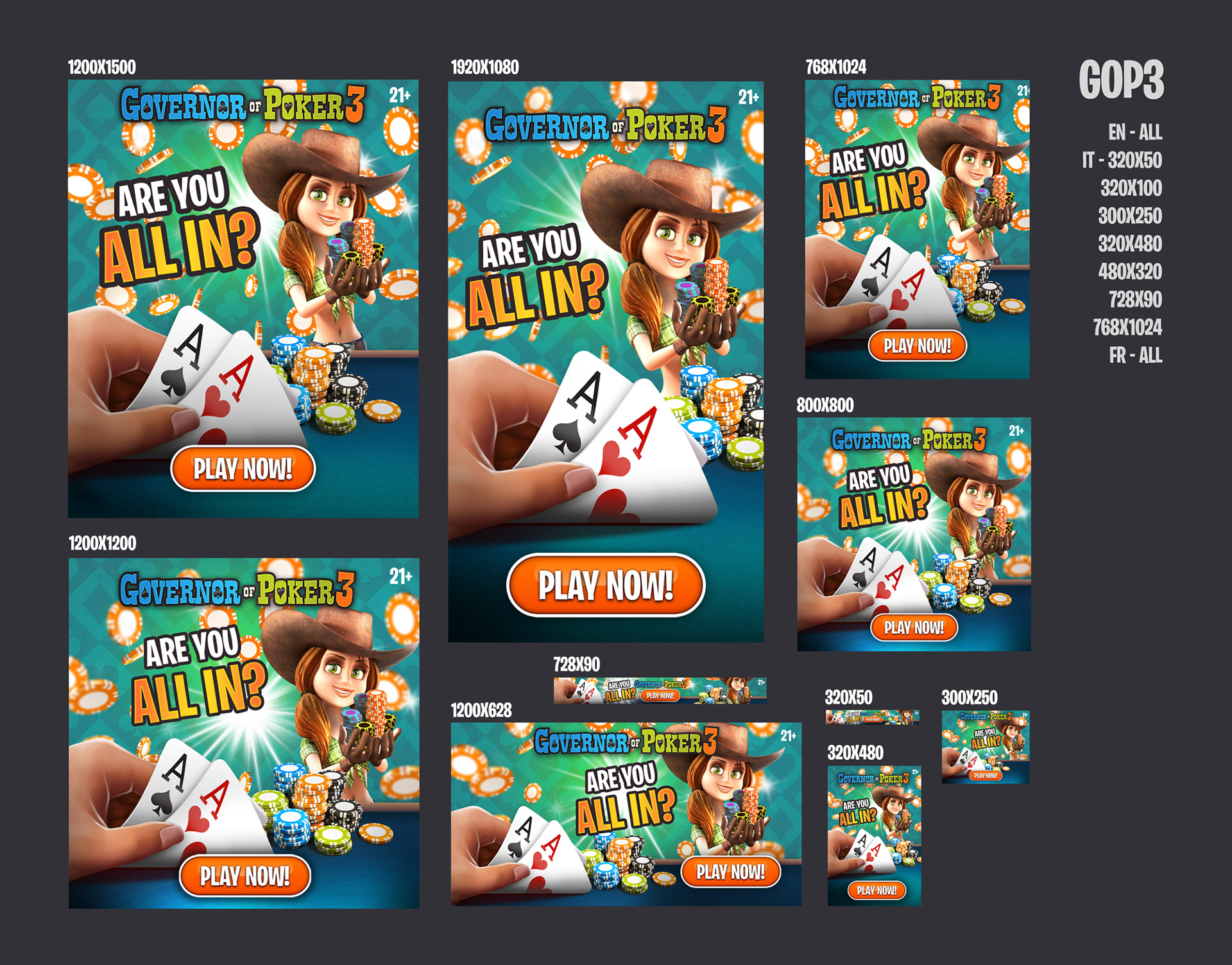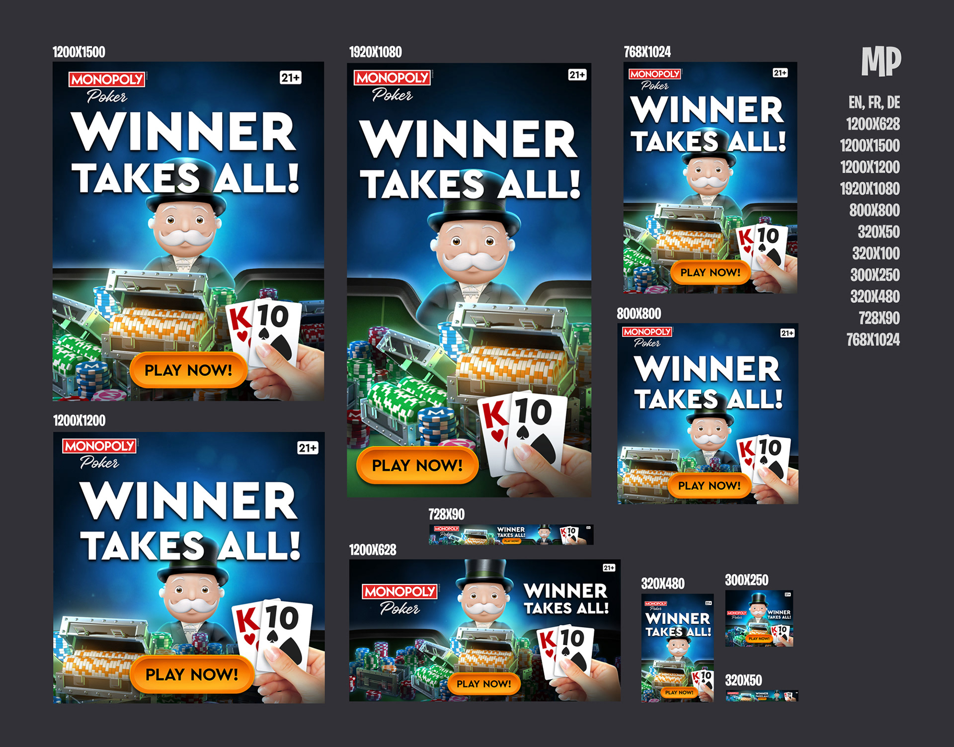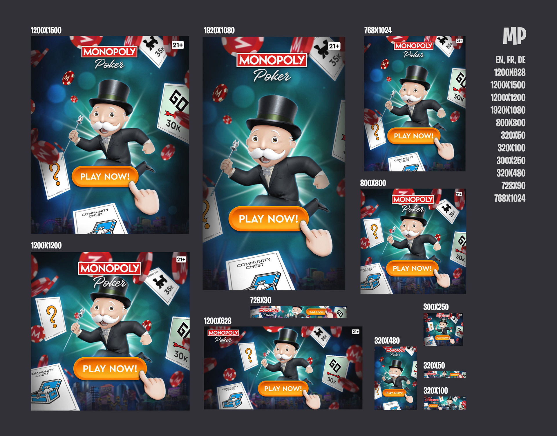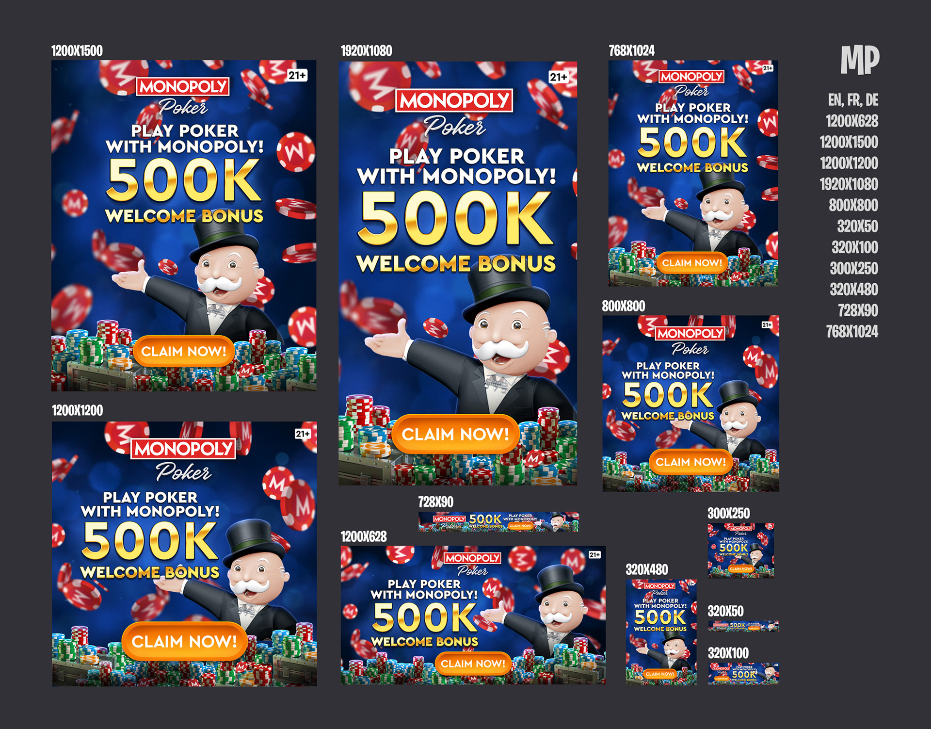 Promotional banners for Google Play and Appstore visuals, web ads and social media content, for their top mobile games, Monopoly Poker and Governor of Poker 3.