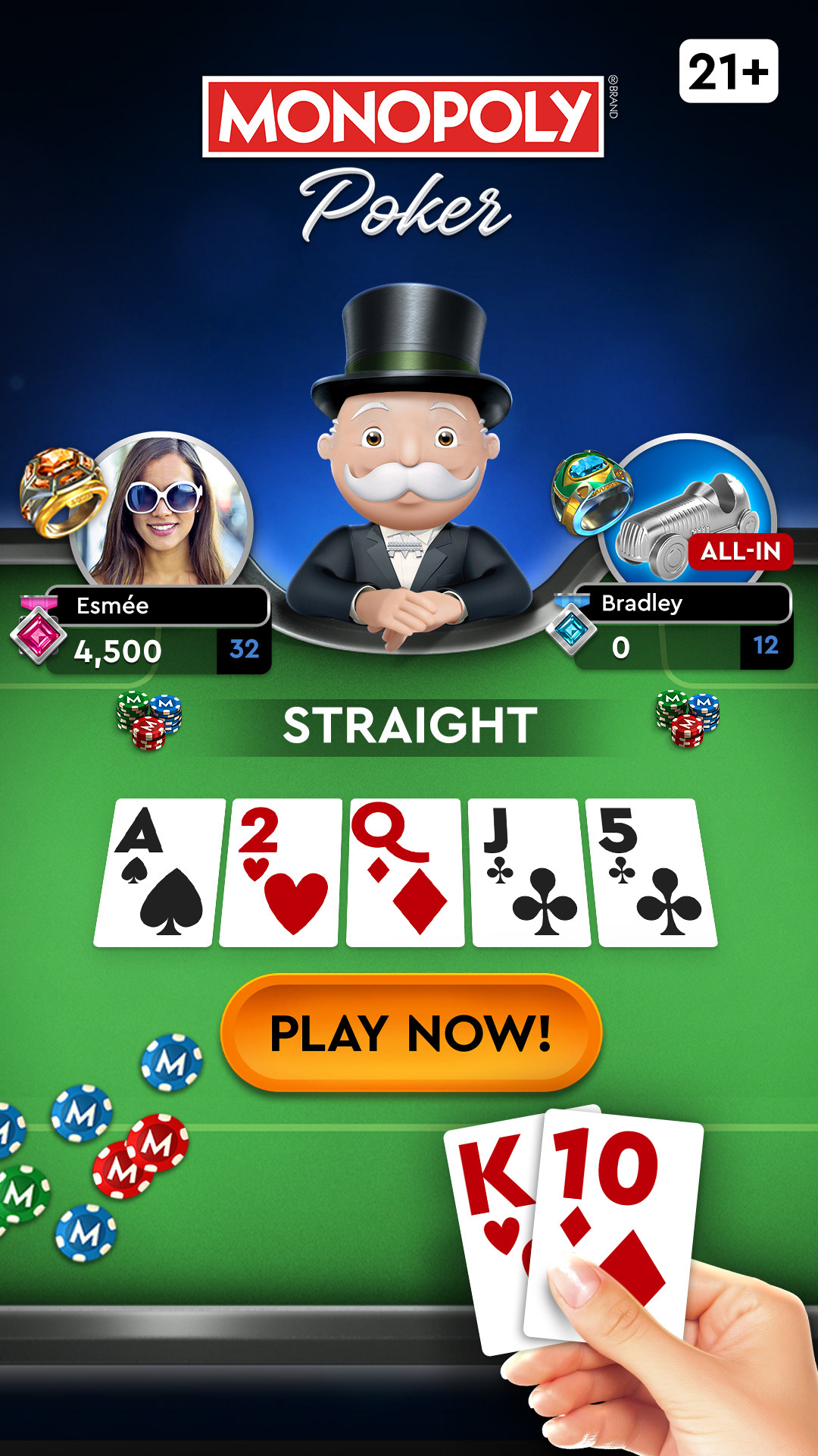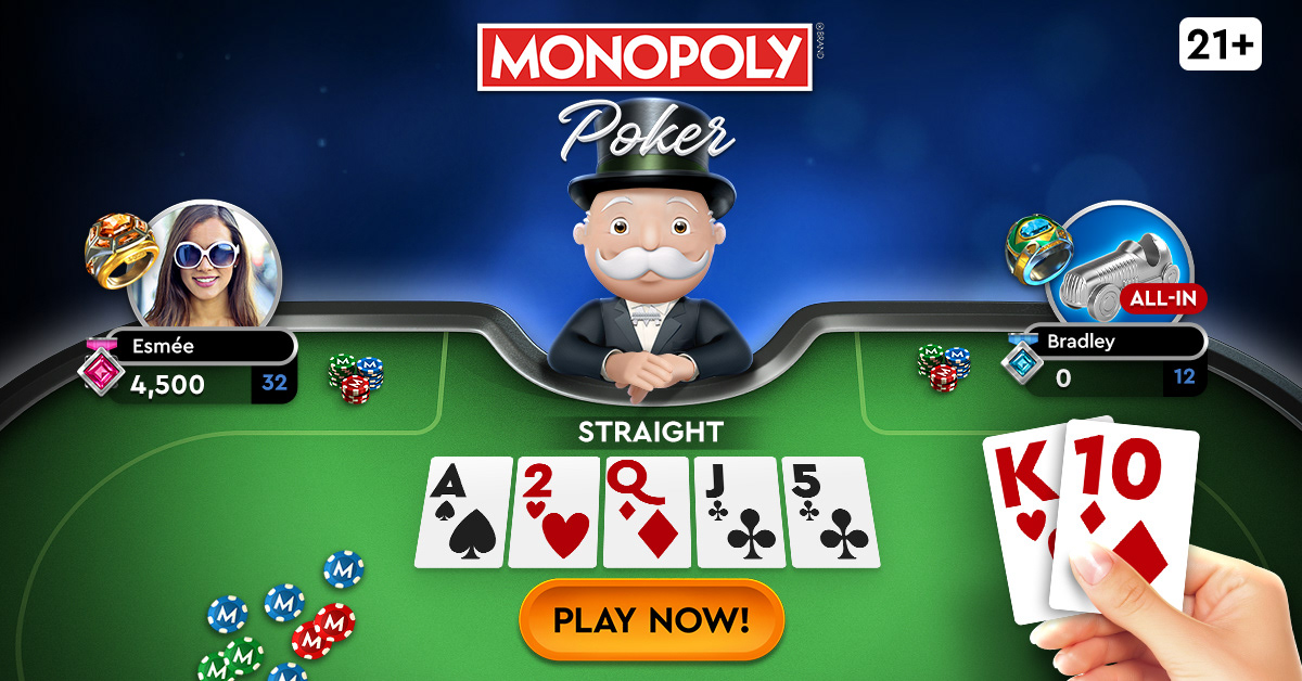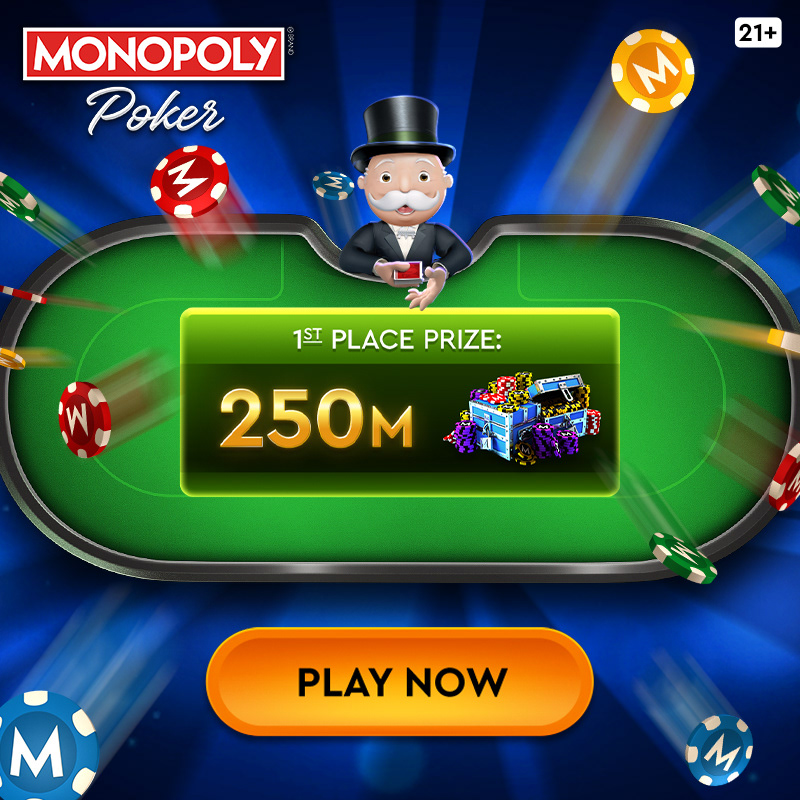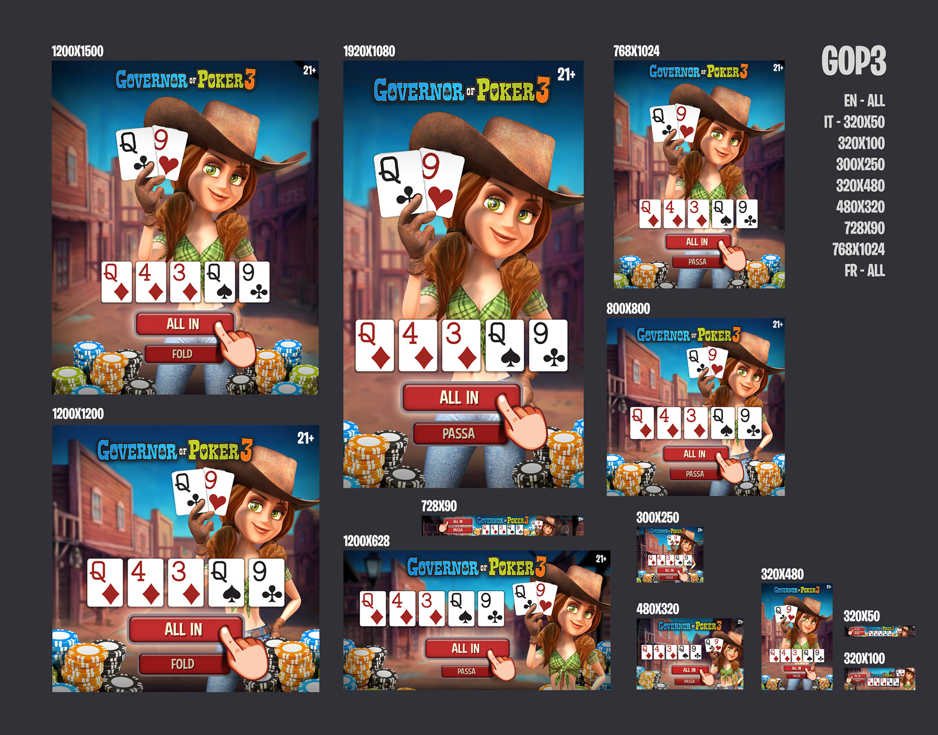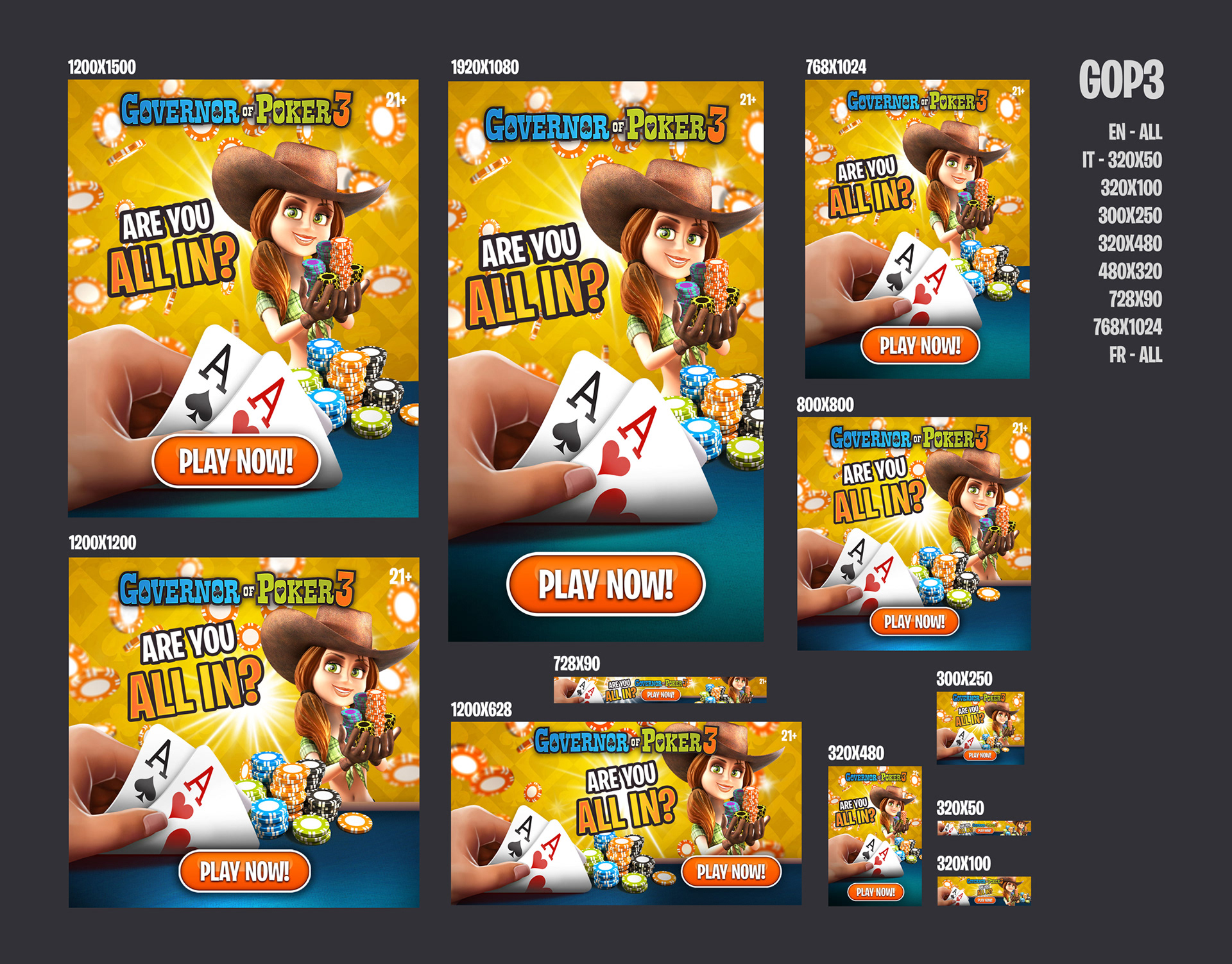 Promotional banners for Google Play and Appstore visuals, web ads and social media content, for their top mobile games, Monopoly Poker and Governor of Poker 3.